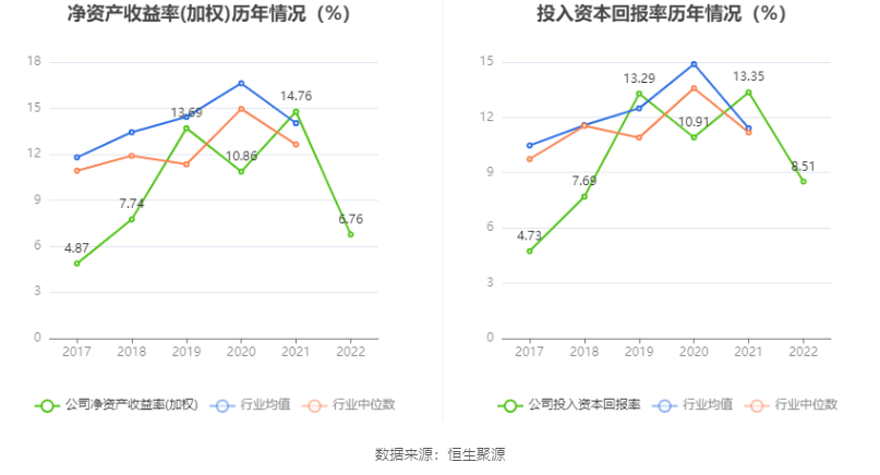 数据显示,2022年公司加权平均净资产收益率为6.76%,较上年同期下降8.00个百分点;公司2022年投入资本回报率为8.51%,较上年同期下降4.84个百分点。