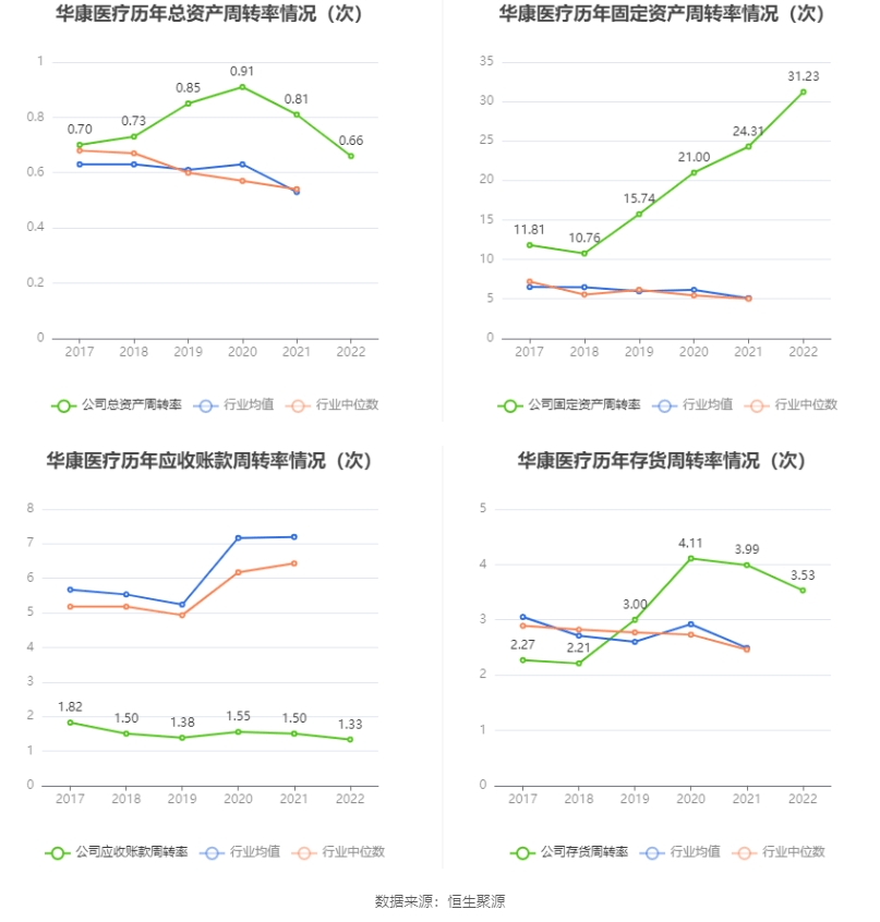 营运能力方面,2022年,公司总资产周转率为0.66次,上年同期为0.81次(2021年行业平均值为0.53次,公司位居同行业7/38);固定资产周转率为31.23次,上年同期为24.31次(2021年行业平均值为5.09次,公司位居同行业4/38);公司应收账款周转率、存货周转率分别为1.33次、3.53次。