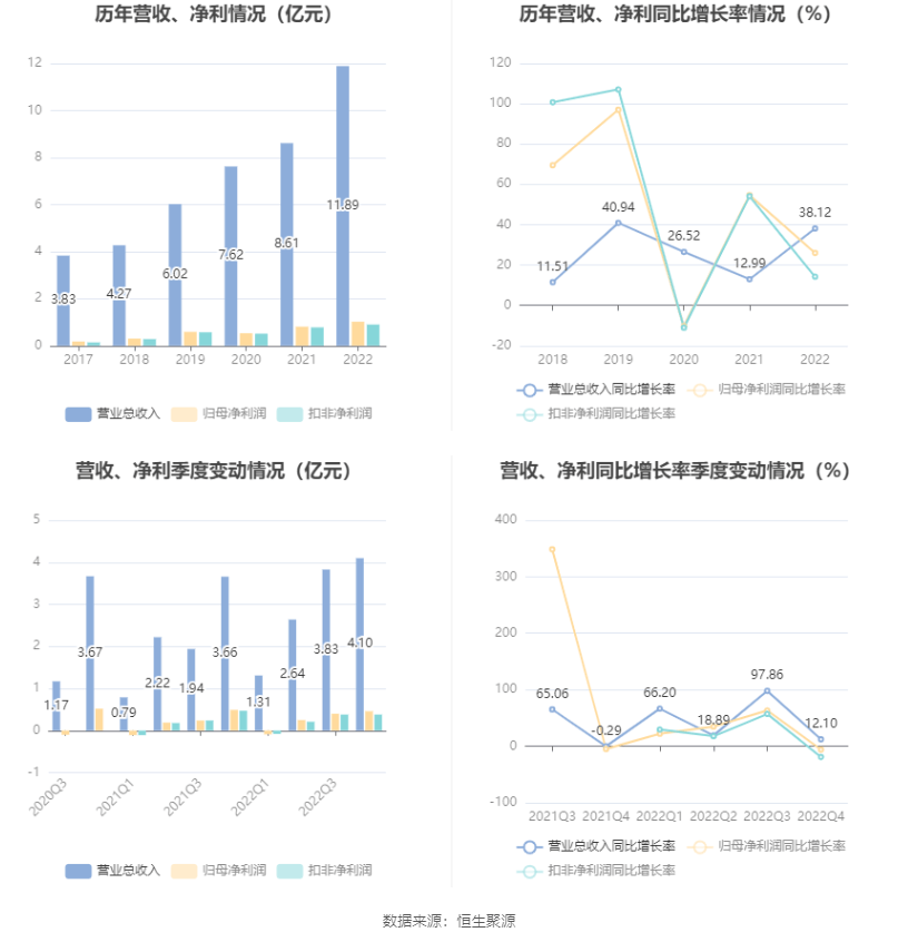中证智能财讯华康医疗(301235)4月25日披露2022年年度报告。2022年,公司实现营业总收入11.89亿元,同比增长38.12%;归母净利润1.02亿元,同比增长25.97%;扣非净利润8960.18万元,同比增长14.21%;经营活动产生的现金流量净额为-3.42亿元,上年同期为4459.27万元;报告期内,华康医疗基本每股收益为0.99元,加权平均净资产收益率为6.76%。公司2022年度分配预案为:拟向全体股东每10股派1.3元(含税)。
