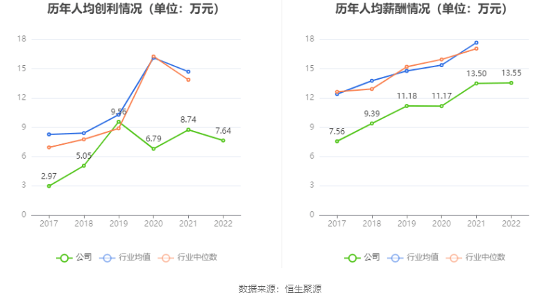 截至2022年末,公司员工总数为1342人,人均创收88.59万元,人均创利7.64万元,人均薪酬13.55万元,较上年同期分别变化-4.18%、-12.61%、0.36%。