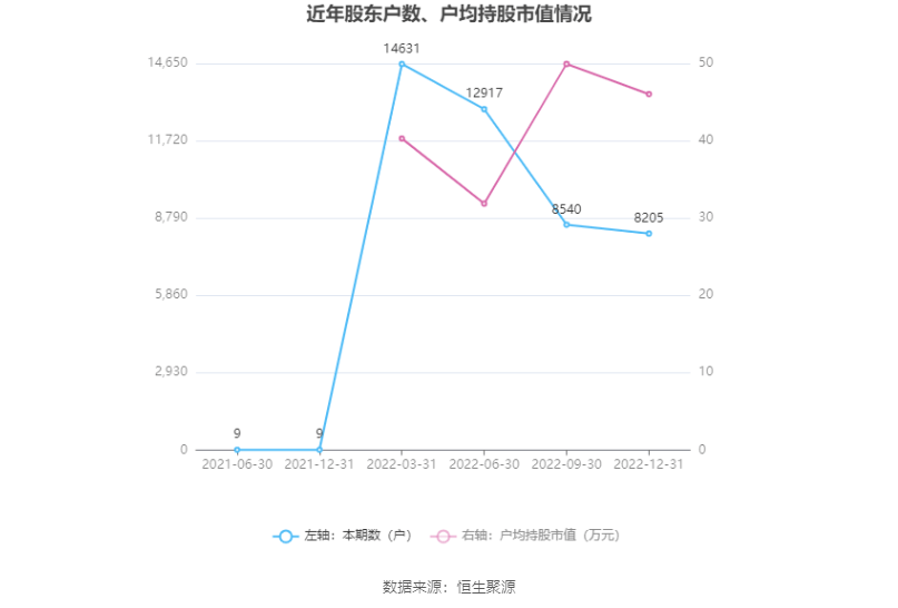 筹码集中度方面,截至2022年末,公司股东总户数为8205户,较三季度末下降了335户,降幅3.92%;户均持股市值由三季度末的49.93万元下降至46.04万元,降幅为7.79%。
