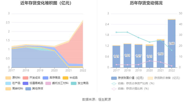 从存货变动来看,截至2022年末,公司存货账面价值为2.66亿元,占净资产的16.08%,较上年末增加1.16亿元。其中,存货跌价准备为411.75万元,计提比例为1.53%。