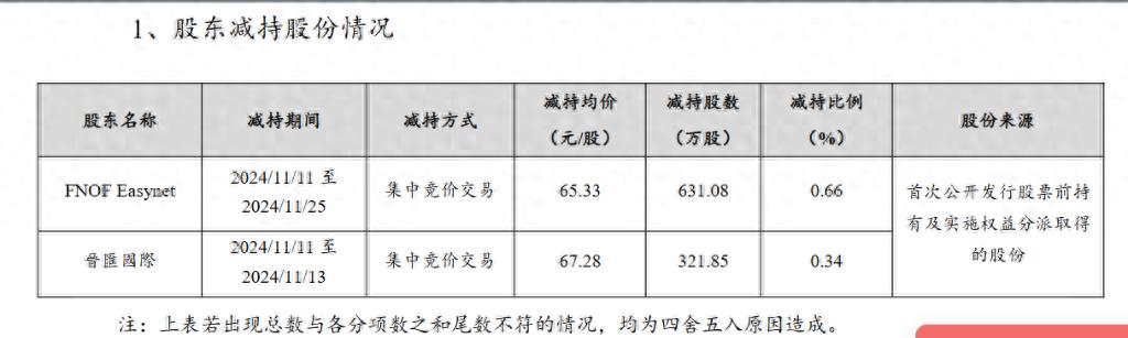 软通动力(证券代码:301236)公告,股东FNOF Easynet(HK)Limited和晉匯國際(香港)有限公司已完成股份减持计划,权益变动达到1%。FNOF Easynet于2024年11月11日至11月25日通过集中竞价交易减持631.08万股,减持均价65.33元/股,减持比例0.66%;晉匯國際于2024年11月11日至11月13日减持321.85万股,减持均价67.28元/股,减持比例0.34%。