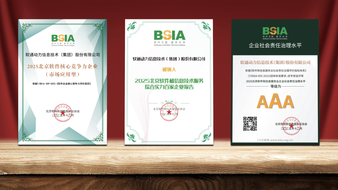 12月23日,以“承续初心智创未来”为主题的北京软件和信息服务业协会(以下简称“协会”)第十一届会员代表大会第三次会议暨2025企业服务年会在京成功召开。软通动力凭借其在技术创新、产业应用与社会责任等方面的卓越表现,获“2025北京软件和信息服务业综合实力百家企业”第七名(较去年提升1名),“2025北京软件核心竞争力企业(市场应用型)”等殊荣,并获评“2025北京软件和信息服务业企业社会责任治理水平”3A等级,充分彰显了企业在行业中的引领地位与可持续发展担当。
