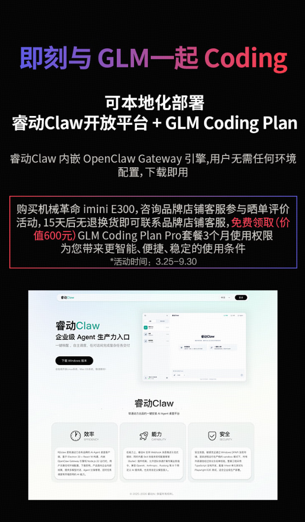 作为机械革命布局AI商用终端的核心力作,imini E300软通睿动AI OpenClaw迷你主机,可一键部署睿动AI客户端,内置免配置OpenClaw Gateway引擎,实现本地化AI模型快速部署,全程无需复杂调试,一键部署完睿动AI客户端后即可开机激活小龙虾生态全功能。依托前沿AI技术加持,这款主机不仅是单纯的运算终端,更化身具备自主执行能力的智能助手,精准响应复杂办公指令、高效完成多链路任务,彻底打破传统电脑“被动操作”的局限,让AI真正赋能商务全流程。