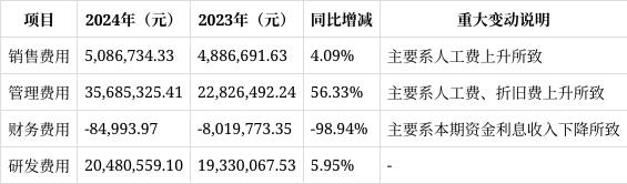 2024年公司销售费用为5,086,734.33元,较2023年的4,886,691.63元增长4.09%,主要系人工费上升所致。管理费用为35,685,325.41元,同比增长56.33%,主要因人工费、折旧费上升。财务费用为-84,993.97元,同比下降98.94%,主要是本期资金利息收入下降。研发费用为20,480,559.10元,较去年增长5.95%。管理费用的大幅增长值得关注,或对公司利润产生持续压力。