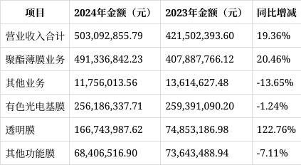 2024年,和顺科技营业收入为503,092,855.79元,相较于2023年的421,502,393.60元,增长了19.36%。从业务构成来看,聚酯薄膜业务收入为491,336,842.23元,占营业收入比重97.66%,同比增长20.46%;其他业务收入11,756,013.56元,占比2.34%,同比下降13.65%。从产品角度,有色光电基膜收入256,186,337.71元,占比50.92%,但同比下降1.24%;透明膜收入166,743,987.62元,占比33.14%,同比大增122.76%;其他功能膜收入68,406,516.90元,占比13.60%,同比下降7.11%。虽然整体营收增长,但各产品表现分化,透明膜增长显著,而有色光电基膜和其他功能膜有不同程度下滑。