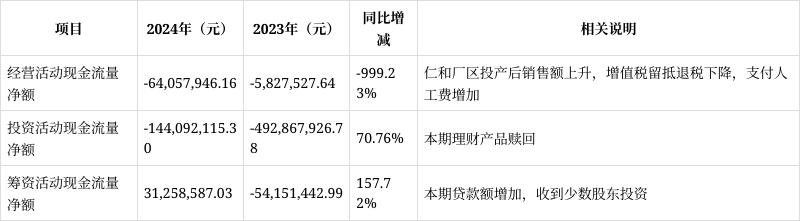 经营活动产生的现金流量净额为-64,057,946.16元,较2023年的-5,827,527.64元下降999.23%。一方面,仁和厂区投产后销售额上升,但增值税留抵退税下降,收到的税费返还下降61.64%;另一方面,支付的人工费增加。投资活动产生的现金流量净额为-144,092,115.30元,同比上升70.76%,主要系本期理财产品赎回。筹资活动产生的现金流量净额为31,258,587.03元,同比上升157.72%,得益于本期贷款额增加以及收到少数股东投资。经营活动现金流量净额的恶化,反映公司经营活动创造现金能力减弱,对公司运营可能带来资金压力。