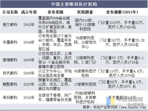 目前,国内较有竞争力的企业有爱尔眼科、华厦眼科、普瑞眼科、何氏眼科、朝聚眼科和希玛眼科等,其中爱尔眼科发展上遥遥领先。