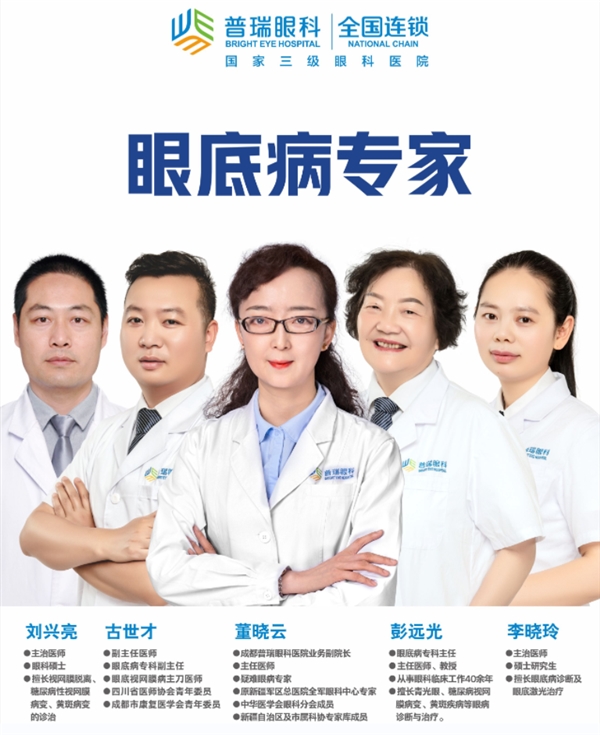 成都普瑞眼科医院眼底病专科由疑难眼病专家董晓云副院长领衔,汇集彭远光教授、古世才副主任、在职硕士研究生李晓玲、眼科硕士刘兴亮等一批经验丰富的眼底病医师,不断开展新技术疗法,对复杂疑难眼病治疗,尤其糖尿病性视网膜病变、黄斑病变、高度近视性视网膜病变、青光眼等有着丰富的临床经验。