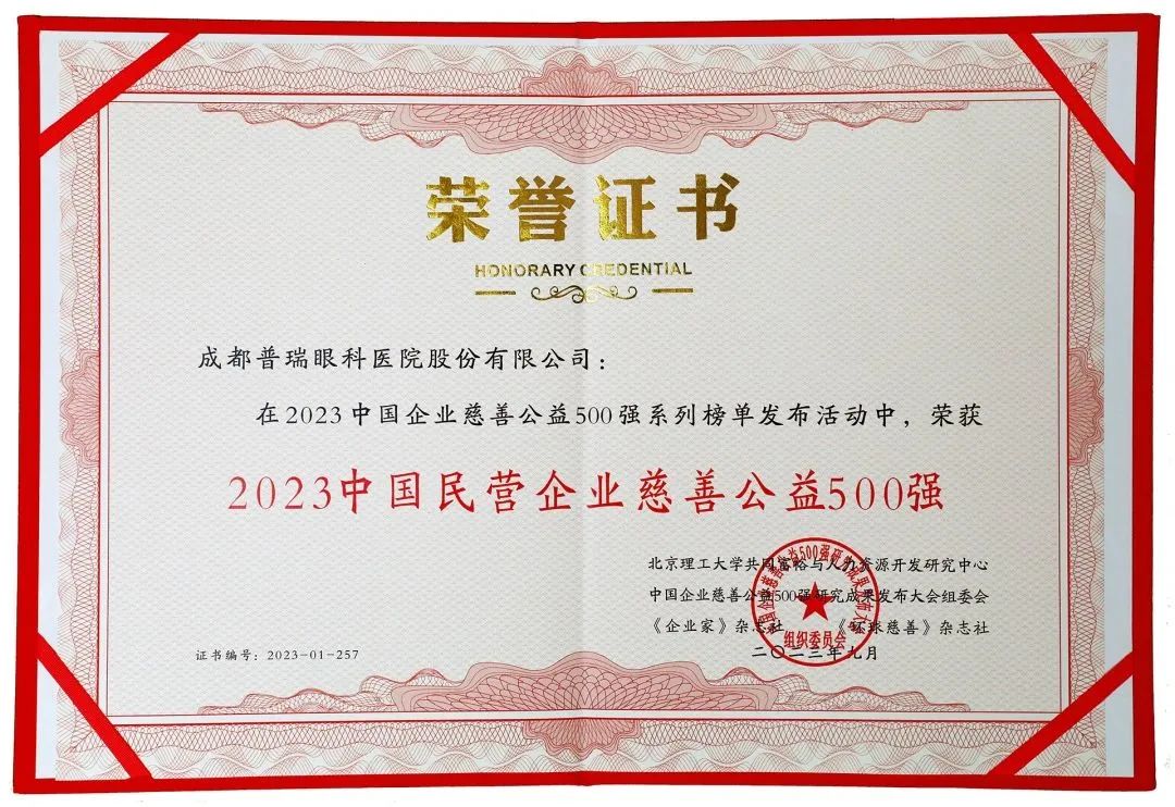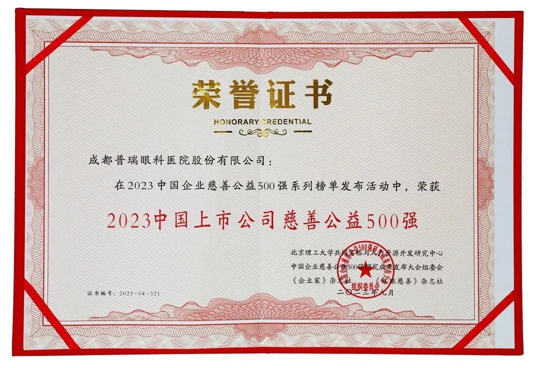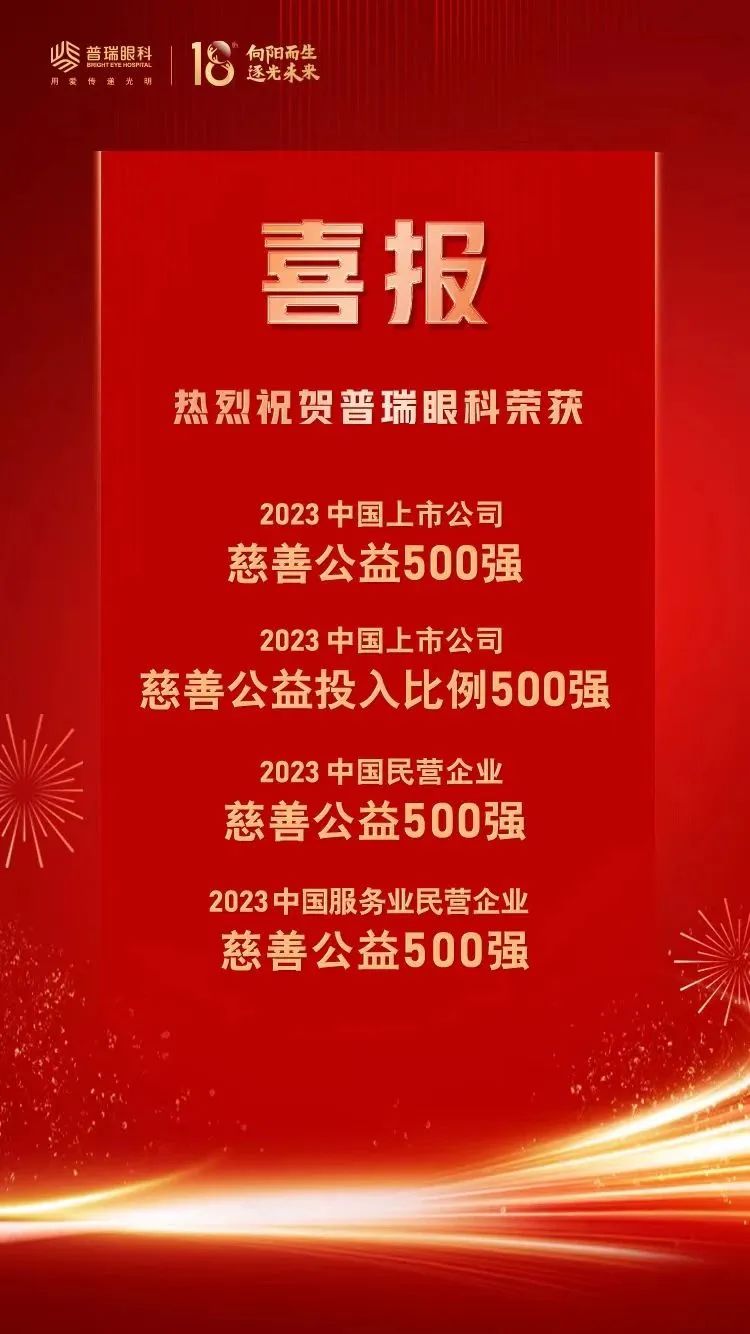 9月23日至24日,以“财富与责任——企业的价值”为主题的2023中国企业慈善公益500强发布暨第七届中国企业慈善公益论坛在河南鹤壁召开。期间,2023中国企业慈善公益500强系列榜单及分析报告重磅发布。凭借在持续推动公益事业发展以及积极承担社会责任方面的贡献,上市眼科医疗连锁品牌普瑞眼科上榜“2023中国上市公司慈善公益500 强”、“2023 中国上市公司慈善公益投入比例500强”、“2023中国民营企业慈善公益500强”、“2023 中国服务业民营企业慈善公益500强”四大榜单。