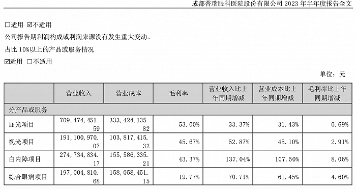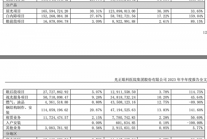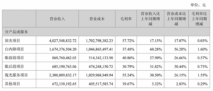 而光正眼科也是专业的眼科连锁医疗企业,主要从事眼科医院的投资、管理业务,目前已经在上海、成都、重庆、郑州、南昌、呼和浩特、济南、青岛、无锡、义乌等10个中心城市开设了14家专业眼科医院和3家眼视光诊所,旗下各家医院的科室设置几乎涵盖了眼科全科诊疗项目。从光正眼科的半年报来看,其屈光项目和白内障项目也是占比最大的。