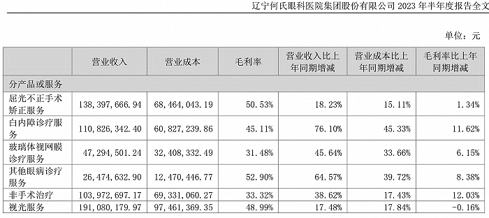 何氏眼科则表示自己是一家集医教研于一体,采用三级眼健康医疗服务模式,着眼于全生命周期眼健康管理的集团型连锁眼健康服务机构,诊疗服务项目包括白内障、青光眼、玻璃体视网膜病变等常见致盲性眼病,也包括干眼、中医等特色诊疗服务;同时,针对屈光不正开展光学矫正、屈光不正手术及视功能训练等眼科专科诊疗服务和视光服务。截至6月末,何氏眼科初级、二级、三级眼保健服务机构共计111家。