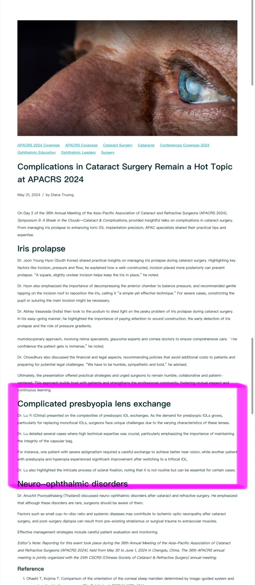 其中,卢奕教授的《复杂老视IOL置换病例》全英文专题发言还被国际APACRS英文版会议新闻版面进行了报道,报道中提到了“卢教授对于老花眼人工晶状体置换的复杂性手术的最新进展”。