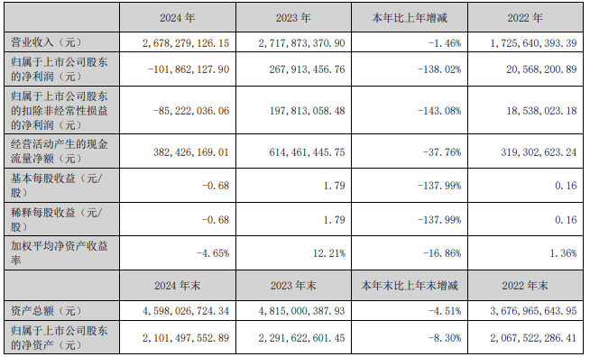 普瑞眼科(301239.SZ)2024年年度报告显示,普瑞眼科报告期内营业总收入为26.78亿元,同比下滑1.46%;归属于上市公司股东的净利润为-1.02亿元,去年同期为2.68亿元;归属于上市公司股东的扣除非经常性损益的净利润为-8522.20万元,去年同期为1.98亿元;经营活动产生的现金流量净额为3.82亿元。