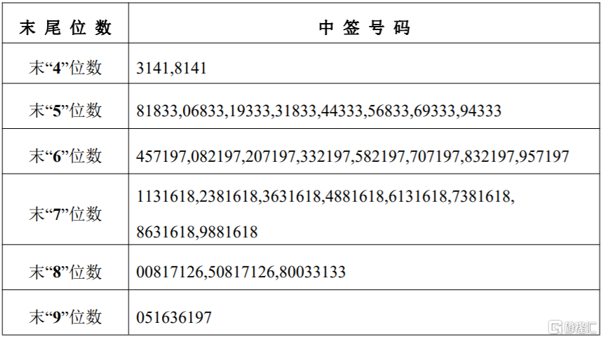 凡参与网上定价发行申购湖北省宏源药业科技股份有限公司首次公开发行A股股票的投资者持有的申购配号尾数与上述号码相同的,则为中签号码。中签号码共有3.686万个,每个中签号码只能认购500股湖北省宏源药业科技股份有限公司A股股票。