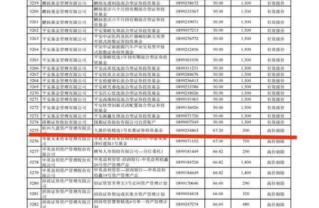 我们查遍了报价信息表,发现报价67.2元/股的基金是:杭州久盈资产管理有限公司旗下久盈价值精选1号私募证券投资基金,报价500万股。