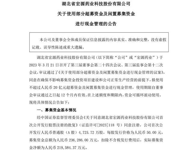 刚刚上市1天,宏源药业在21号晚上就提出了现金管理计划公告,公告称:2023年3月21日他们开会审议通过了《关于使用部分超募资金及闲置募集资金进行现金管理的议案》,同意拟使用不超过人民币20亿元超募资金及闲置募集资金进行现金管理,使用期限自董事会审议通过之日起12个月内有效。