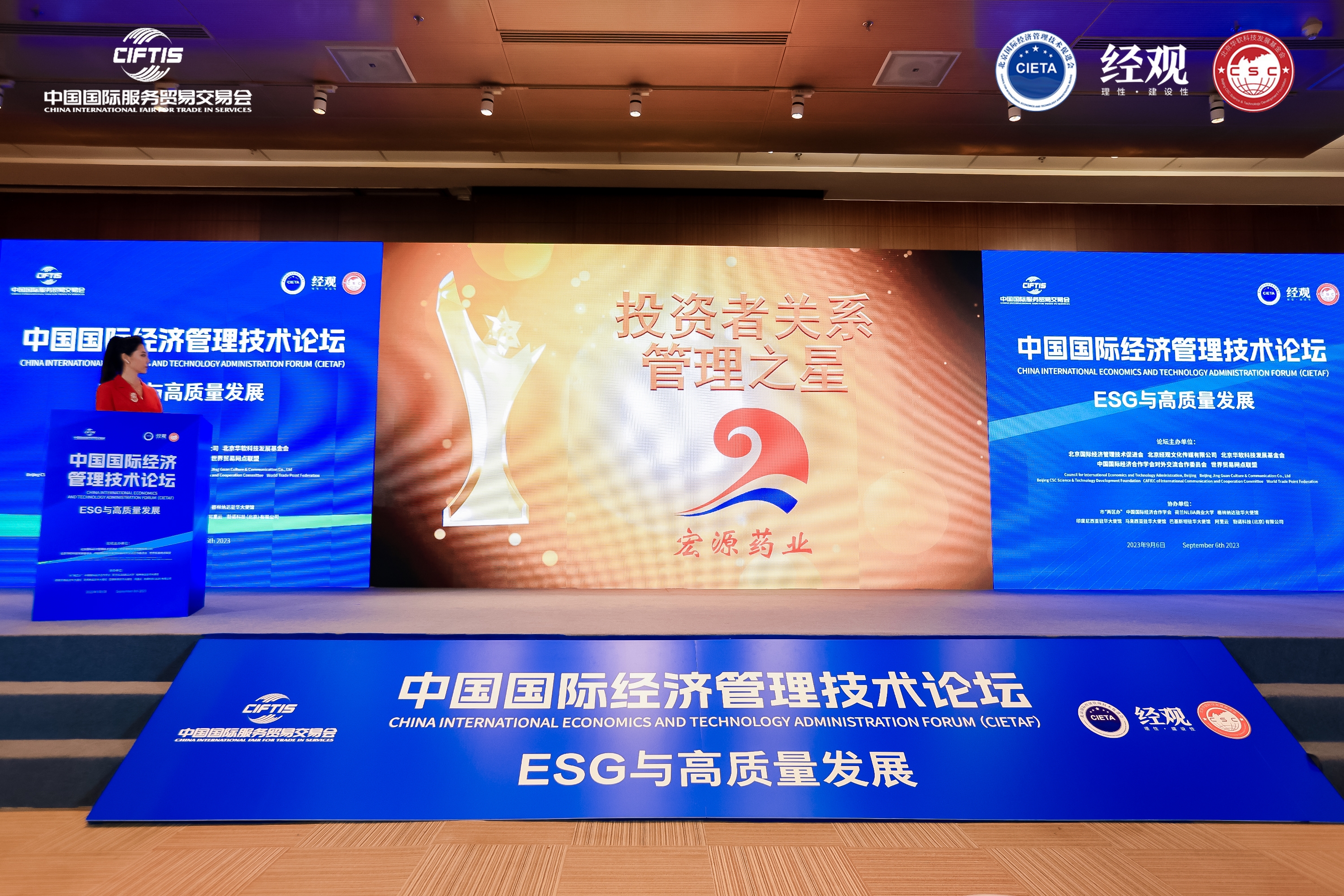 2023年9月6日,北京国家会议中心成功举办了“服贸会·中国国际经济管理技术论坛暨2023ESG与高质量发展峰会”。本届论坛由北京国际经济管理技术促进会、经观传媒、商务部中国国际经济合作学会、北京华软科技发展基金会联合举办,旨在甄选最具影响力和最具企业社会责任的公司作为行业领袖,树立行业标杆,推动行业的高质量发展。会上,湖北省宏源药业科技股份有限公司(以下简称:宏源药业,股票代码:301246)荣获“投资者关系管理之星”荣誉。