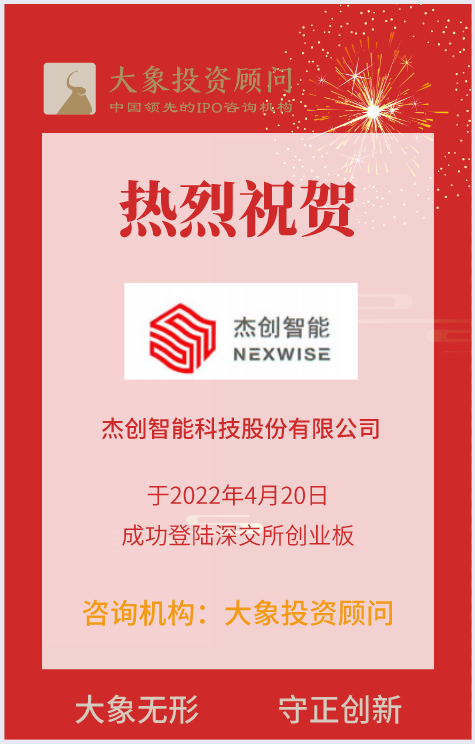 2022年4月20日,大象投顾客户——杰创智能科技股份有限公司成功登陆深交所创业板。