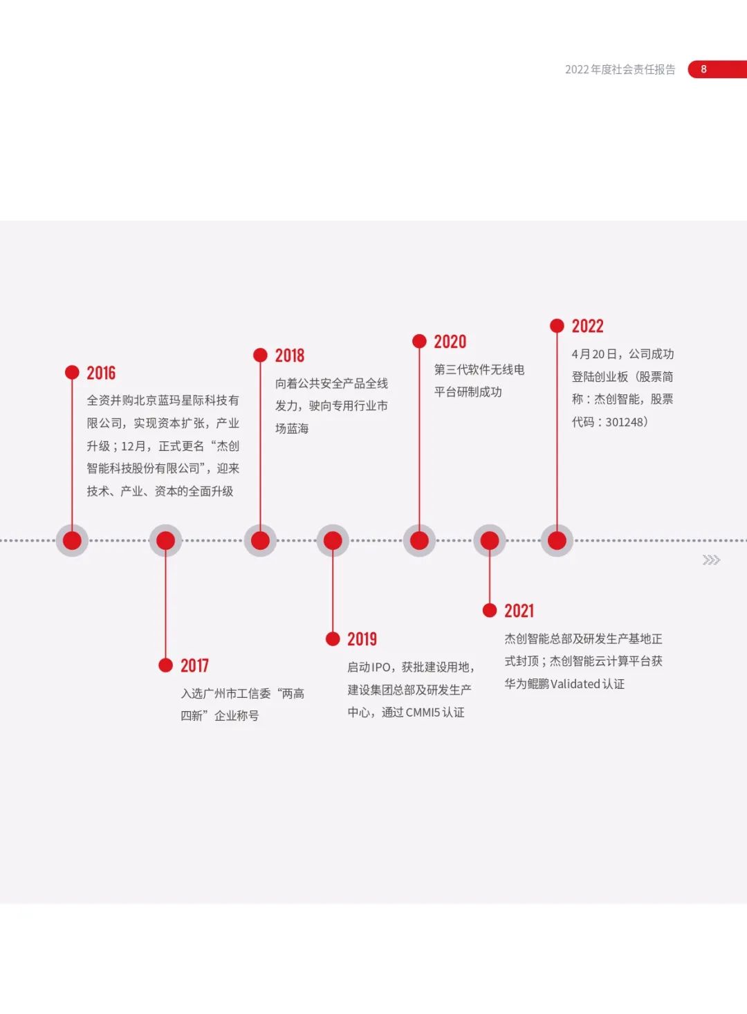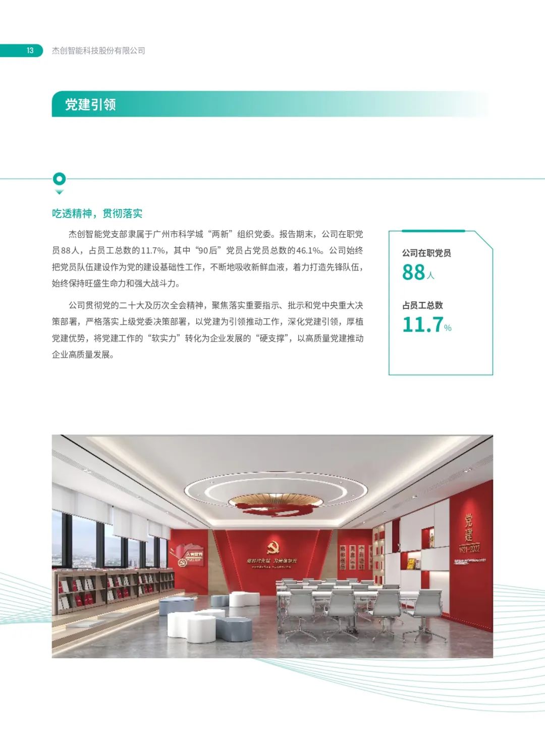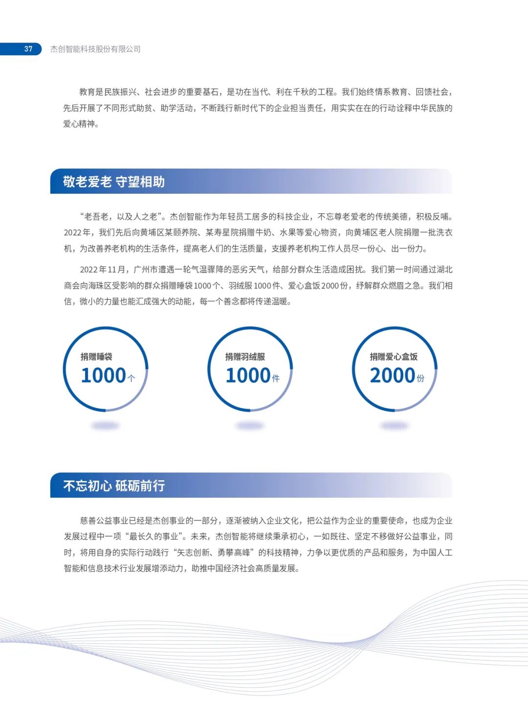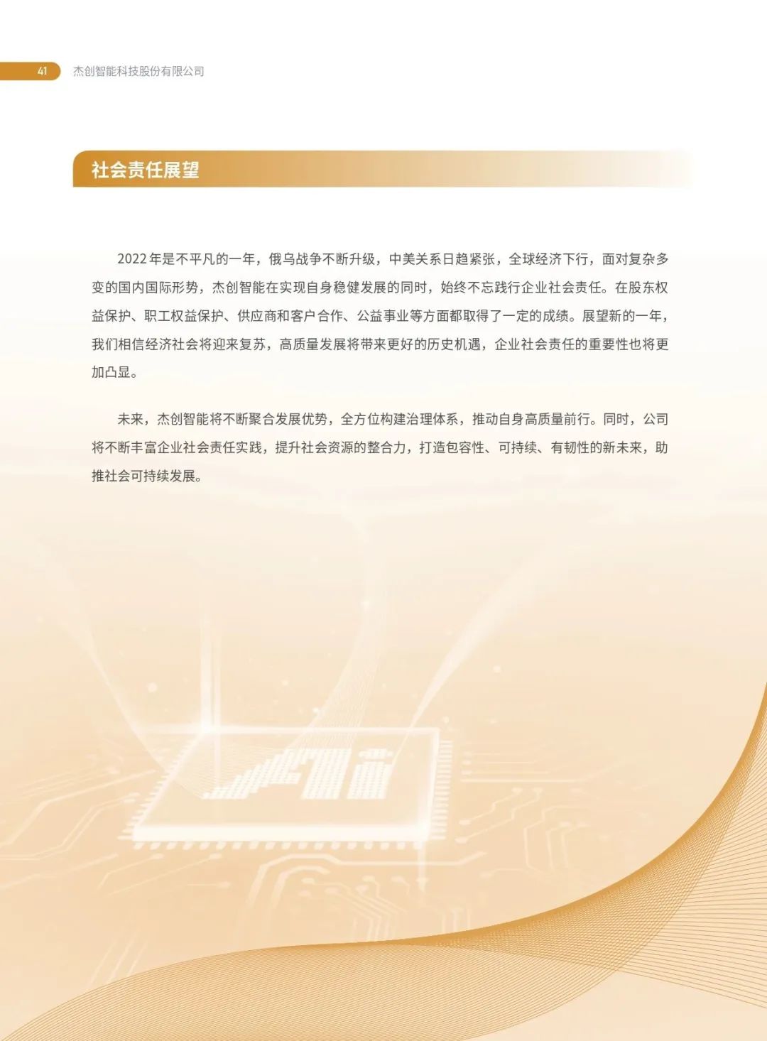 日前,杰创智能(301248)发布2022年社会责任报告(环境、社会及管治报告),这是杰创智能首次公开发布社会责任报告,报告从公司治理、科技创新、客户服务、绿色环保、公益慈善等角度,全面展示了公司坚持服务国家战略、服务行业发展,推动经济社会可持续和高质量发展的履责实践和成效。