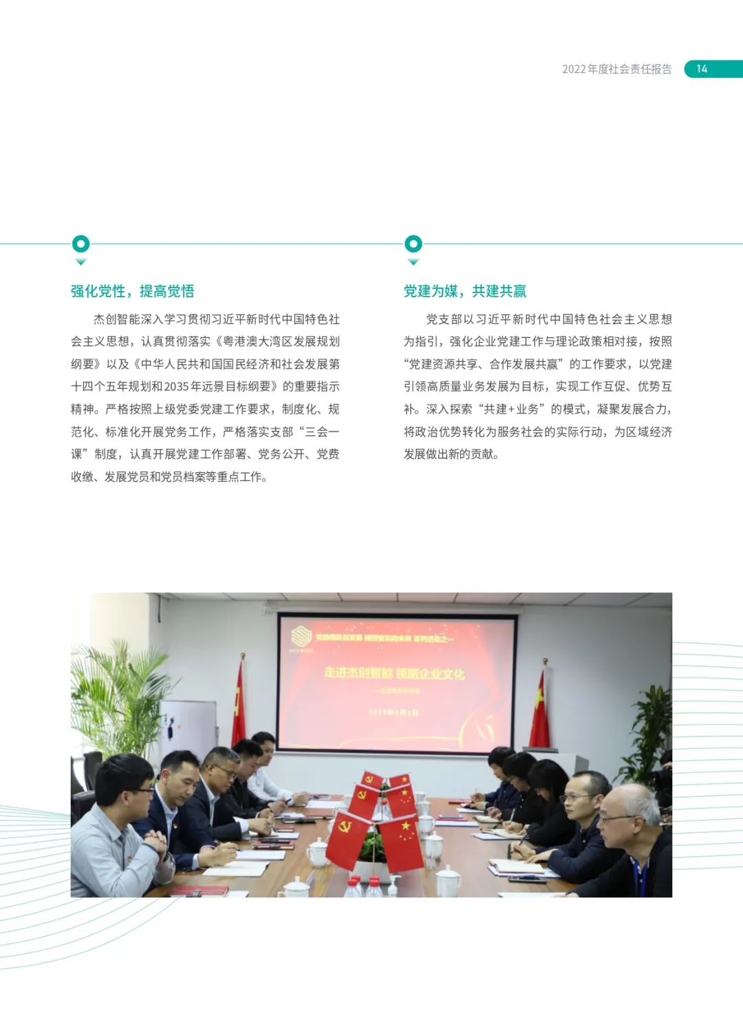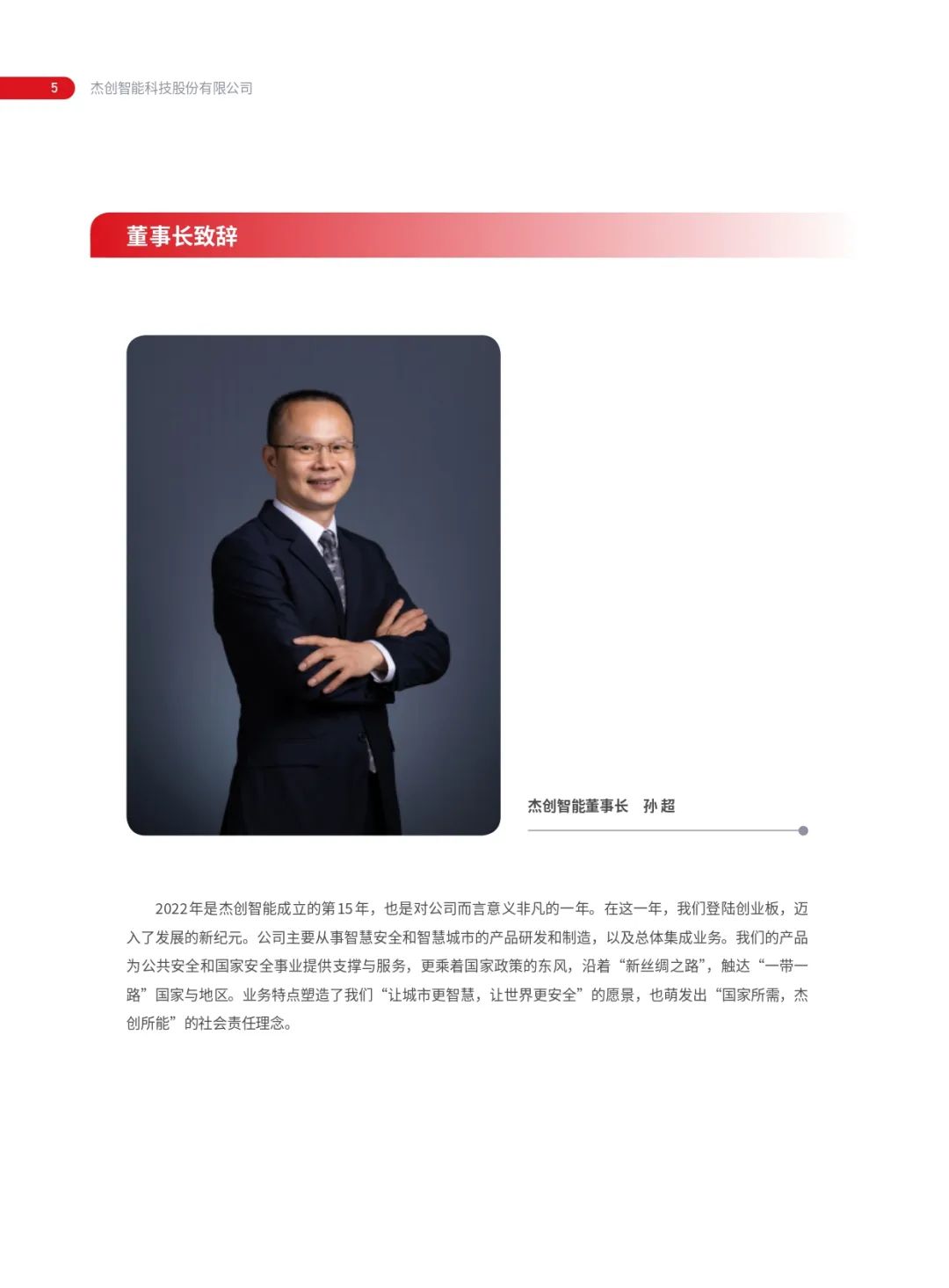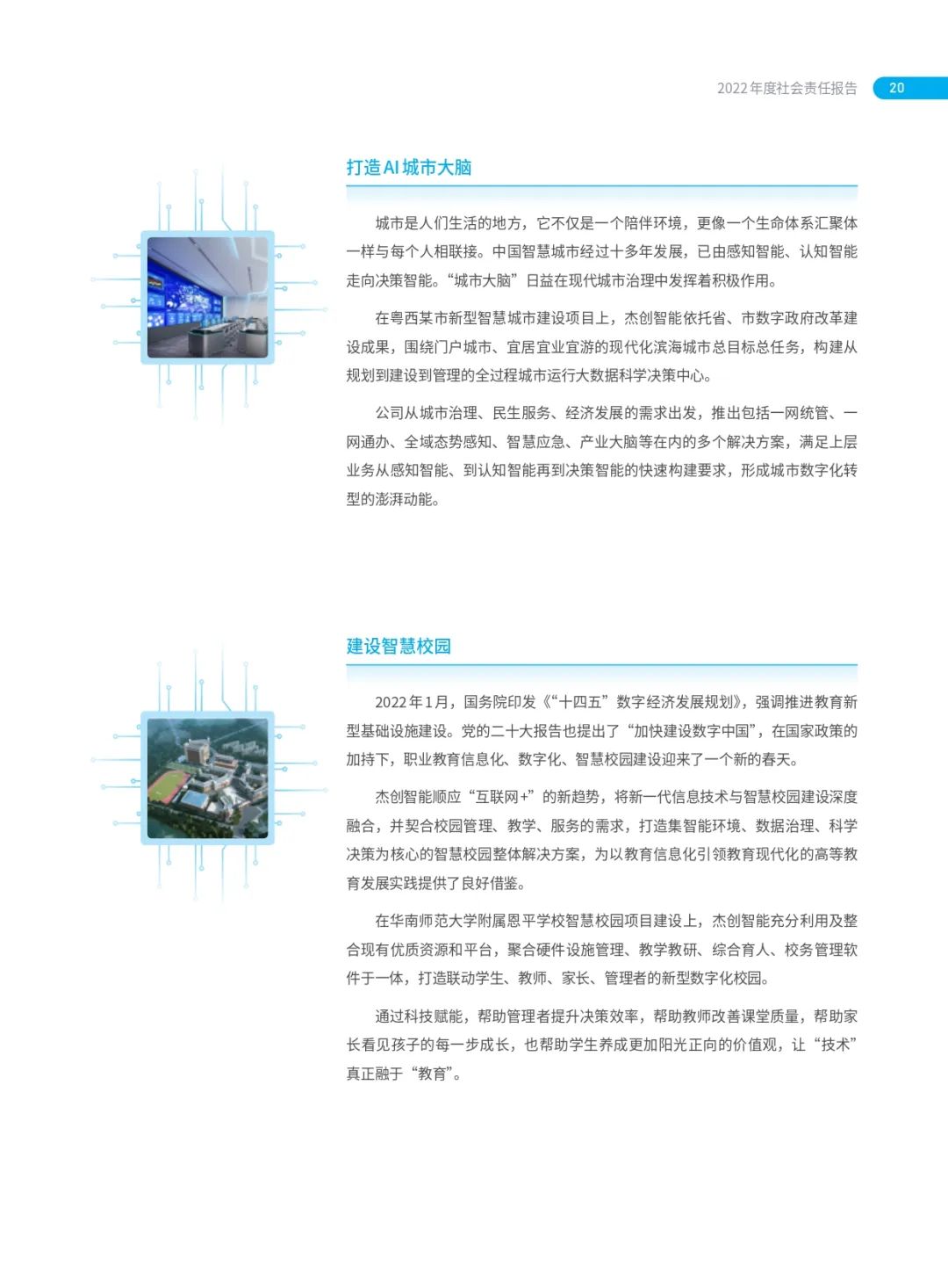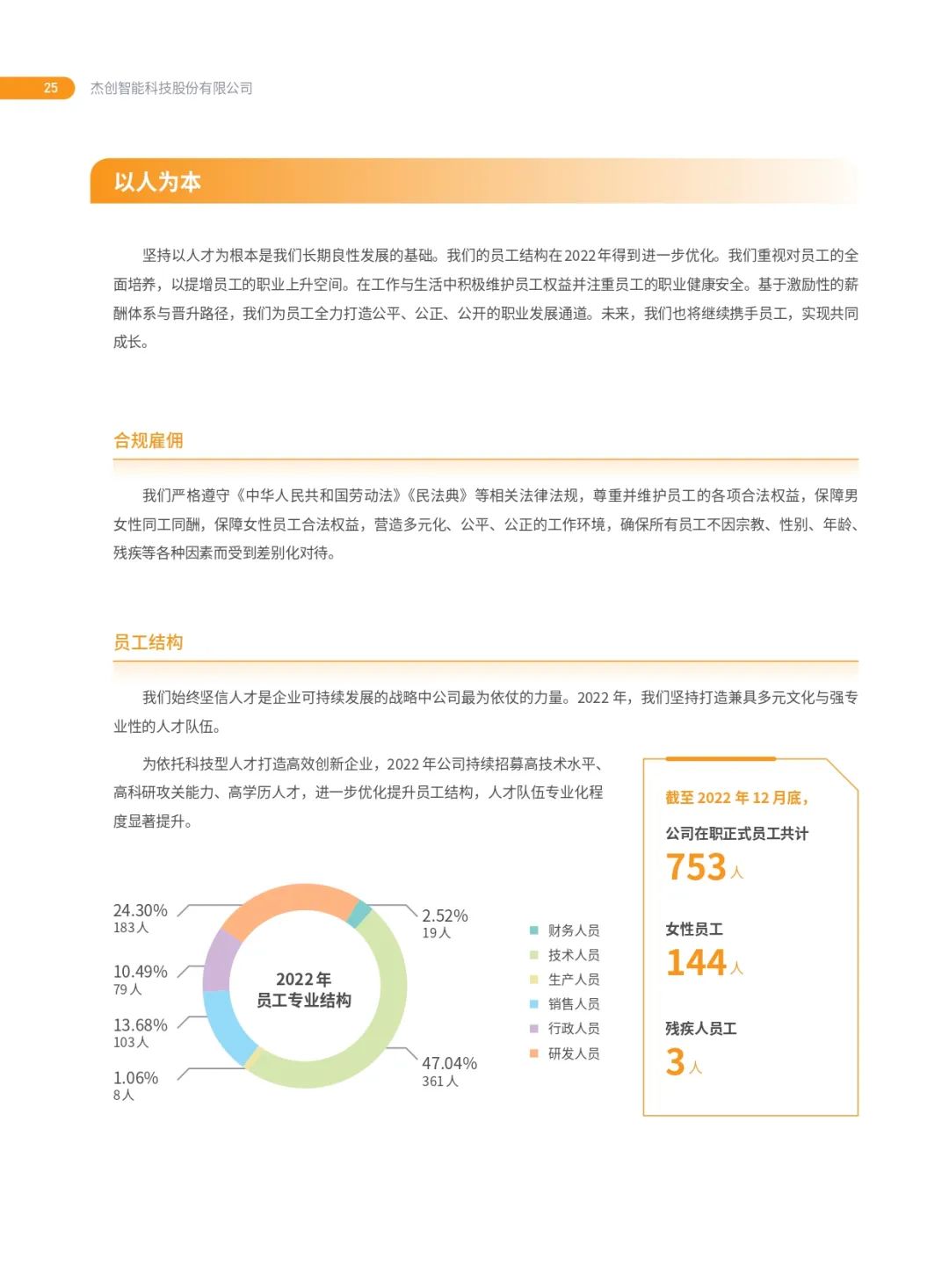 日前,杰创智能(301248)发布2022年社会责任报告(环境、社会及管治报告),这是杰创智能首次公开发布社会责任报告,报告从公司治理、科技创新、客户服务、绿色环保、公益慈善等角度,全面展示了公司坚持服务国家战略、服务行业发展,推动经济社会可持续和高质量发展的履责实践和成效。