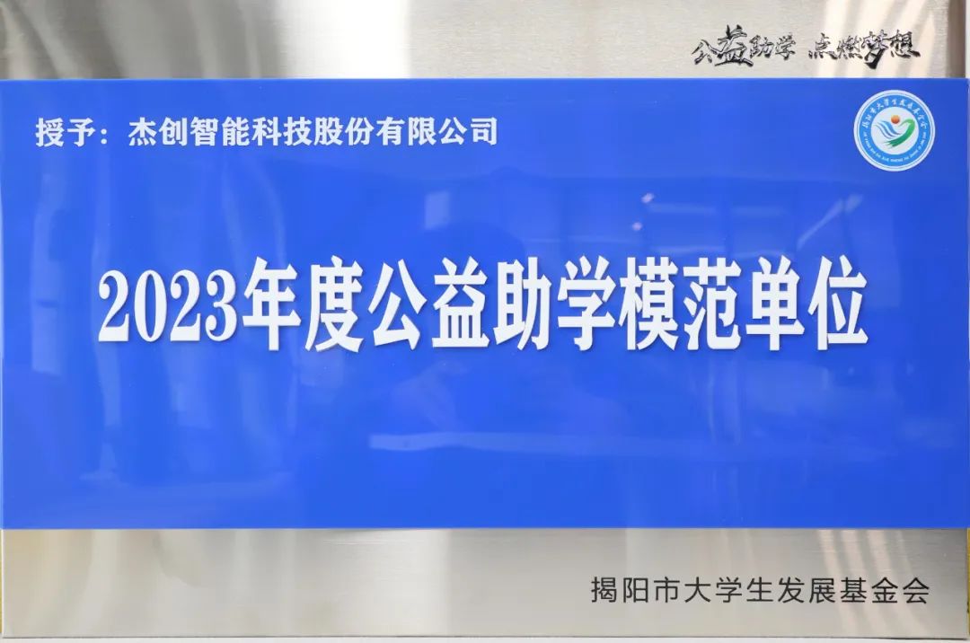 12月5日,揭阳市团委书记陈颖聪带领揭阳市大学生发展基金会秘书处相关人员到访杰创智能,并授予杰创智能“2023年度公益助学模范单位”荣誉称号,以表达杰创智能长期以来支持揭阳公益事业的感谢。