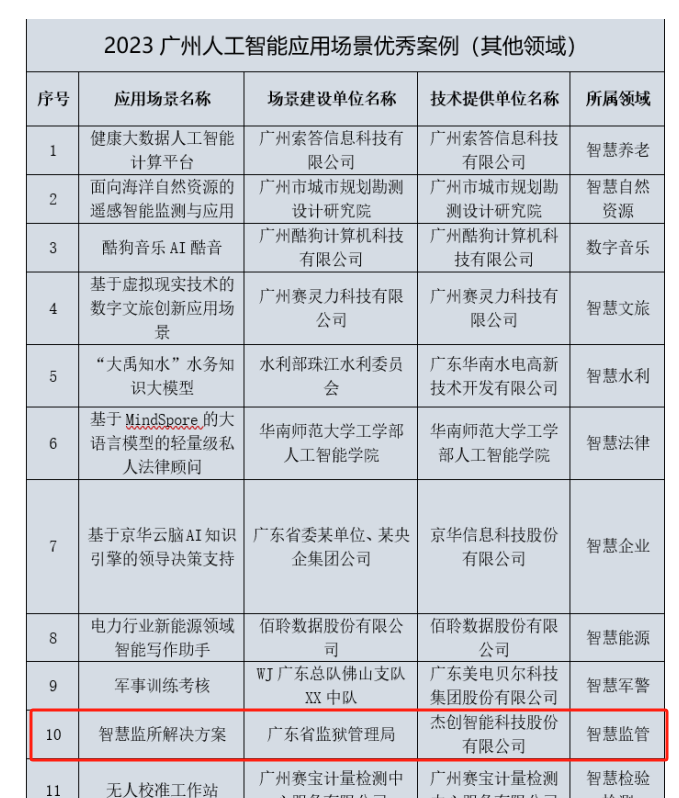 近日,2023国际人工智能生态发展高峰论坛暨人工智能创新发展榜单发布活动举办,论坛发布了备受瞩目的“2023年''百智荟聚''人工智能创新发展榜单”。杰创智能凭借在人工智能领域的卓越表现和创新能力,获评“2023广州人工智能创新发展榜单-最具影响力人工智能企业”,智慧监所解决方案应用案例入选“2023 广州人工智能应用场景优秀案例”。