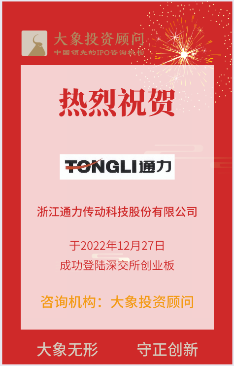 2022年12月27日,大象投顾客户——浙江通力传动科技股份有限公司成功登陆深交所创业板。