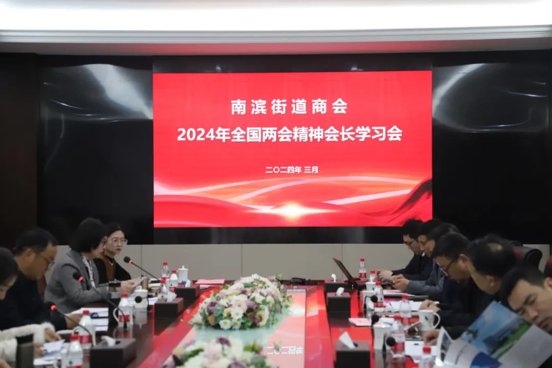 会议上,南滨商会秘书长姜吴宵带领大家一起学习两会精神,以新质生产力要素为引擎赋能传统产业和浙江省优化营商环境条例。