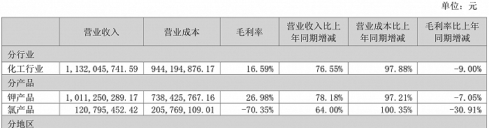 华融化学主要原材料为氯化钾,世界氯化钾资源分布不均衡,加拿大、俄罗斯、白俄罗斯合计储量占全球氯化钾资源总储量 85%以上,产量占全球 60%以上。中国是氯化钾需求最大的国家,而国产氯化钾仅能满足一半的需求,另外约一半需要进口。报告期内,中国2022年氯化钾海运大合同价格为CFR590美元/吨(到岸价,含税),折算人民币进口成本超过4300元/吨,较2021年大幅上涨139%,同时受到地缘政治冲突爆发的影响,欧盟和美国对俄罗斯的石油、天然气、化肥等多项产品进行了制裁,虽然后期化肥被列入制裁豁免名单,但全球化肥、粮食贸易、海运格局依旧因此发生变化,继而影响氯化钾行情进一步走高。