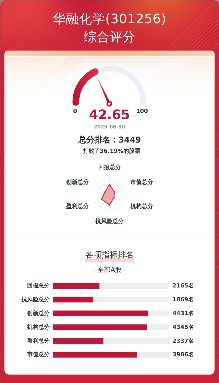 金融界上市公司研究院构建了一套上市公司韧性评价体系,从企业盈利、科技创新、股东回报、经营抗风险、市值表现及机构吸引力六个维度对企业进行量化评分,满分为100分。华融化学的韧性评价总分为42.65分,在A股5405家可比上市公司中排名第3449位。