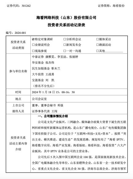 海看股份向投资者介绍了公司整体情况。公司是文化产业振兴、三网融合、媒体融合政策大背景下诞生的互联网科研和视听新媒体运营机构,是山东广播电视台、山东广电传媒集团旗下国有控股子公司。公司定位于“互联网+科技+文化+资本”,按照“突出主业、梯次推进、建设生态”的发展思路,规划布局了“海看IPTV、海看数字应用、海看产业发展、海看版权、海看科技、海看投资”六大产业板块,其中IPTV业务是公司的主营业务。