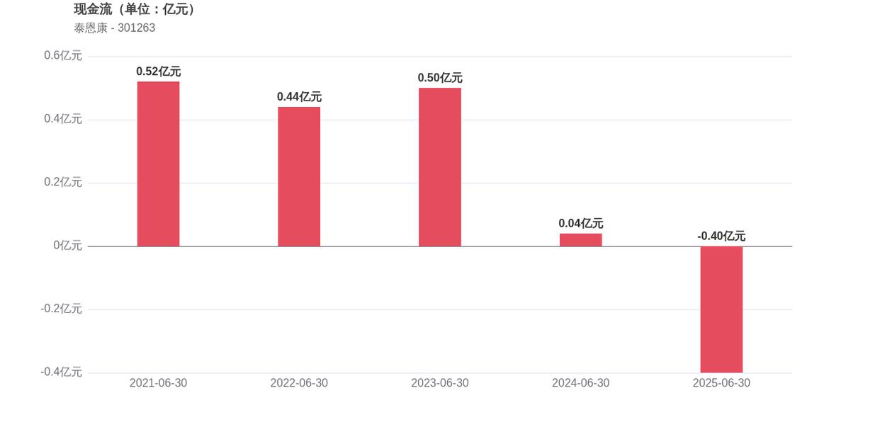 在经营稳健性方面,泰恩康面临存货周转效率下降的压力,存货周转天数为133.63天,较2024年上半年增长了22.97%,表明公司库存管理效率有所下降。经营活动产生的现金流净额为-0.4亿元,相比2024年同期的0.04亿元由正转负,显示出公司现金流状况承压。此外,2025年上半年的资产负债率为27.52%,同比增长了6.53个百分点,这意味着公司负债水平有所上升。