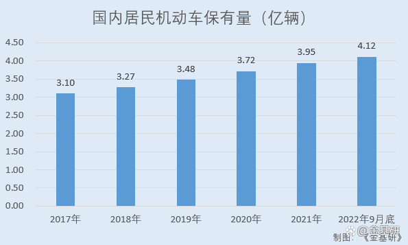 据公安部数据,2017-2021年,国内居民机动车保有量分别为3.10亿辆、3.27亿辆、3.48亿辆、3.72亿辆、3.95亿辆。截至2022年9月底,全国机动车保有量达4.12亿辆。