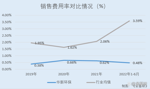 据招股书,2019-2021年及2022年1-6月,华新环保销售费用率分别为0.38%、0.66%、0.62%、0.48%。同期,华新环保同行业可比公司东江环保、格林循环、中再资环、启迪环境、大地海洋、超越环保、飞南资源、镇江固废的销售费用率均值分别为1.95%、1.62%、2.06%、3.59%。