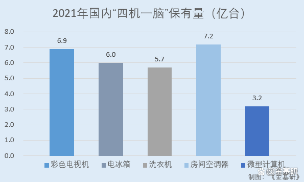 据《中国废弃电器电子产品回收处理及综合利用行业白皮书2021》数据,2021年,国内彩色电视机居民保有量为6.9亿台,电冰箱6.0亿台,洗衣机5.7亿台,房间空调器7.2亿台,微型计算机3.2亿台。