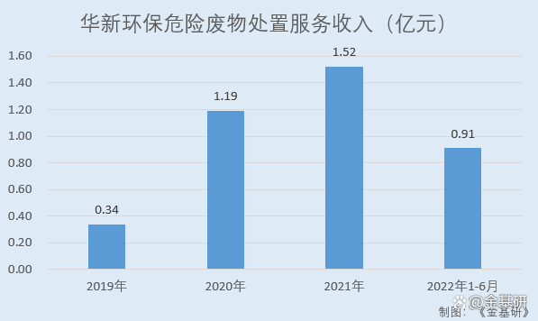 据招股书,2019-2021年及2022年1-6月,华新环保危险废物处置服务收入分别为0.34亿元、1.19亿元、1.52亿元、0.91亿元,2019-2021年年均CAGR达110.42%。