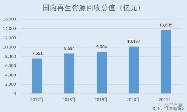 根据商务部、中国物资再生协会《中国再生资源回收行业发展报告》数据,2017-2021年,国内再生资源回收总值分别为7,551亿元、8,684亿元、9,004亿元、10,137亿元、13,695亿元,呈不断上升趋势,其中2021年同比增长35.1%。