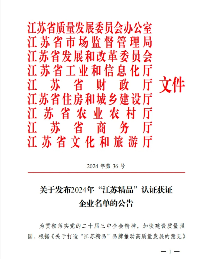 据悉,“江苏精品”认证是江苏省在新形势下参照国际惯例、运用市场机制推进品牌战略的一项开拓性工作,其主要目的就是以标准为引领、以认证为手段,通过对符合高标准、高品质要求的产品和服务进行第三方认证,推动形成一批自主创新、品质高端、服务优质、信誉过硬、市场公认的“江苏精品”品牌群体。