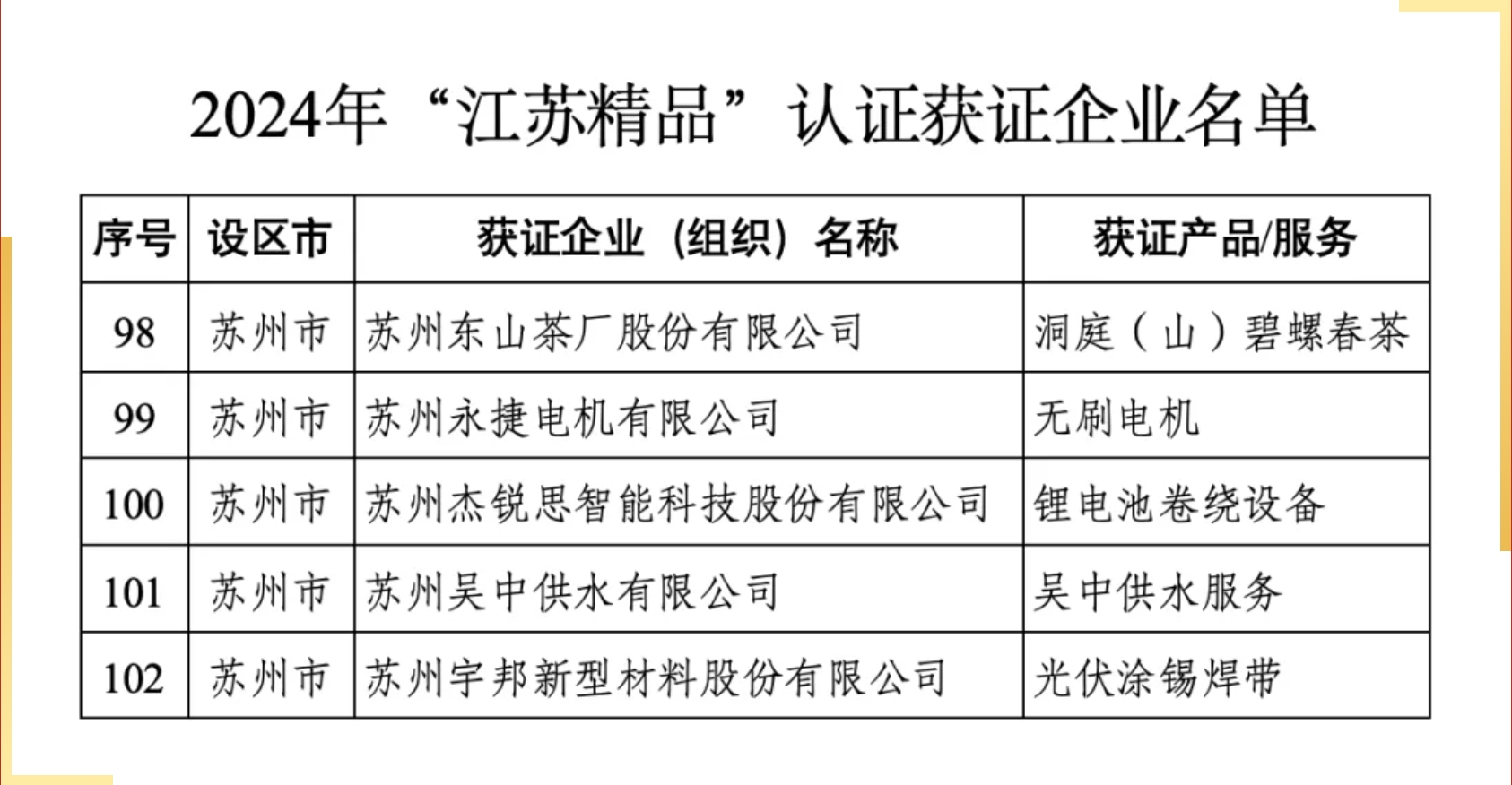 近日,2024年“江苏精品”认证获评企业名单公布,吴中区苏州宇邦新型材料股份有限公司(简称“宇邦新材”)的“光伏涂锡焊带”上榜。
