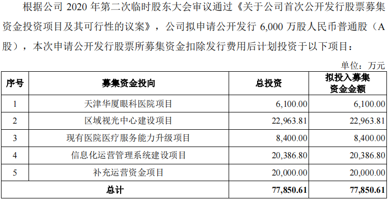 本次创业板IPO,华厦眼科拟募资7.8亿元,计划用于天津华厦眼科医院项目、区域视光中心建设项目、现有医院医疗服务能力升级项目、信息化运营管理系统建设项目,以及补充运营资金项目等。