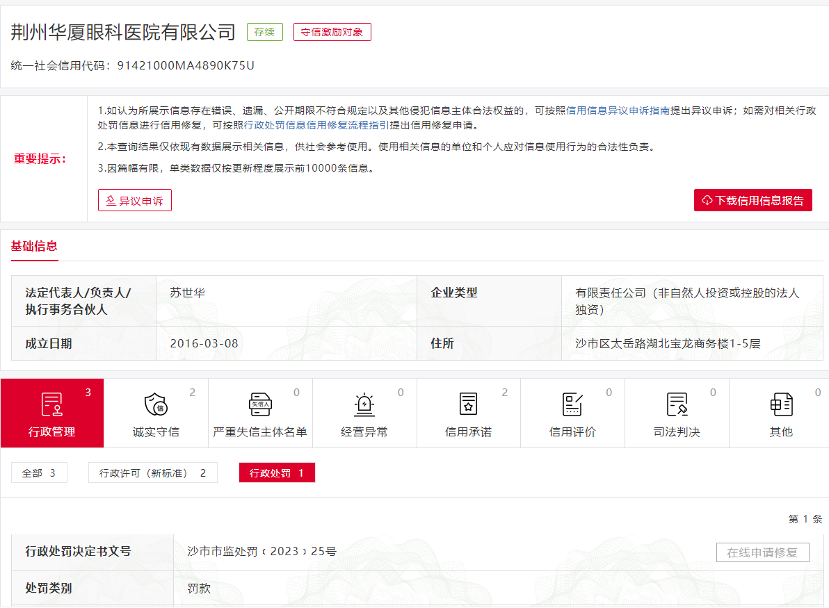近日,记者从信用中国获悉,荆州华厦眼科医院有限公司因医疗广告违法,被湖北省荆州市沙市区市场监管局处罚。