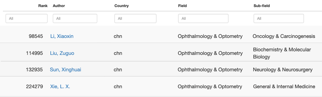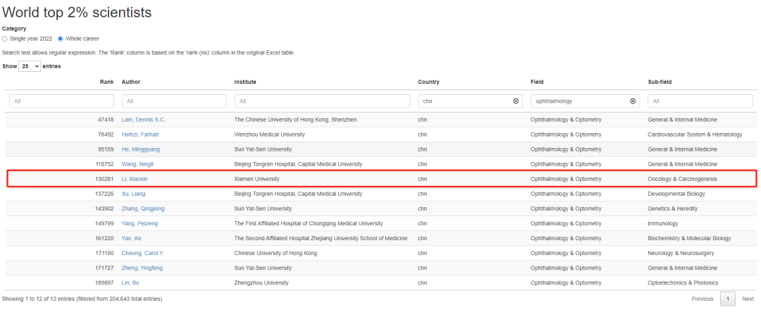 近日,美国斯坦福大学发布了第六版《年度全球前2%顶尖科学家榜单》(World’s Top 2% Scientists),国际眼科科学院院士、厦门眼科中心总院长黎晓新教授入选“终身科学影响力排行榜”,同时与厦门眼科中心院士工作站导师中国工程院院士谢立信教授、华厦眼科科技创新委员会主席孙兴怀教授、厦门眼科中心名誉院长刘祖国教授,四人共同入围全球“2023年度科学影响力排行榜”!