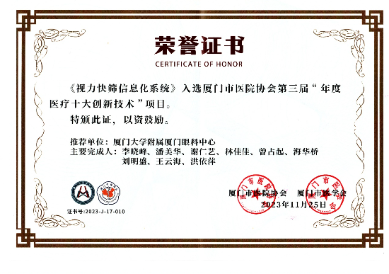 11月25日,在厦门市医院协会第三届年会暨“学科引领高质量发展”学术会议上,华厦眼科医院集团本部厦门大学附属厦门眼科中心“视力快筛信息化系统”(简称“视力快筛”)荣获厦门市医院协会第三届“年度医疗十大创新技术”项目。