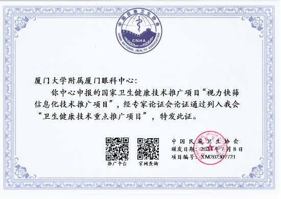 在入选厦门市医院协会第三届“年度医疗十大创新技术”项目之前,华厦眼科“视力快筛信息化系统”凭借“合规、准确、安全、高效、及时、可推广”六大优势,经国家卫生健康技术应用推广项目专家论证会论证,成功列入2023年度“国家卫生健康技术重点推广项目”。