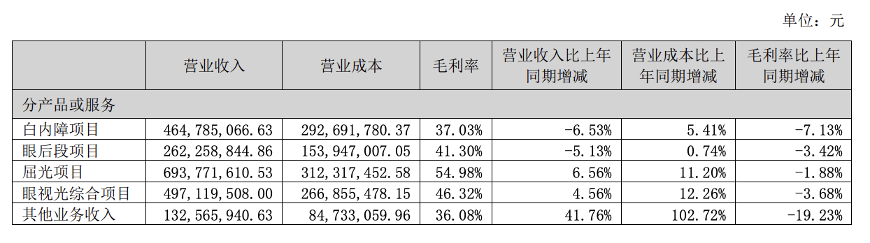 分产品和服务来看,2024年上半年,公司白内障项目和眼后段项目上半年营收出现明显下滑,营收分别为4.65亿元、2.62亿元,分别同比下滑6.53%、5.13%。毛利率分别为37.03%、41.3%,同比分别减少7.13个百分点和3.42个百分点。