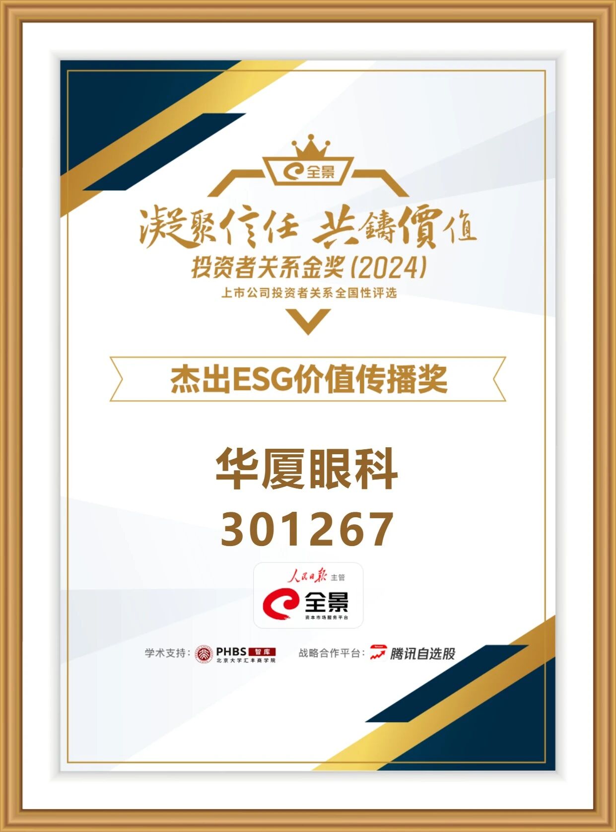 8月27日,由全景网主办的第六届全景投资者关系金奖(2024)评选结果正式揭晓,华厦眼科凭借在可持续发展实践及ESG信息披露、价值传播等方面的突出表现,荣获“杰出ESG价值传播奖”!