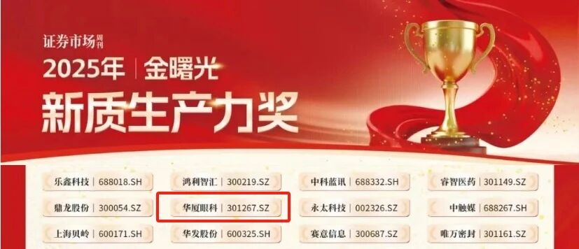 近日,由《证券市场周刊》主办的2025年市值管理“金曙光”评选圆满收官,八大权威奖项正式揭晓。凭借在科研技术创新、智能化转型等方面的突出成果, 华厦眼科 荣获“金曙光新质生产力奖”。