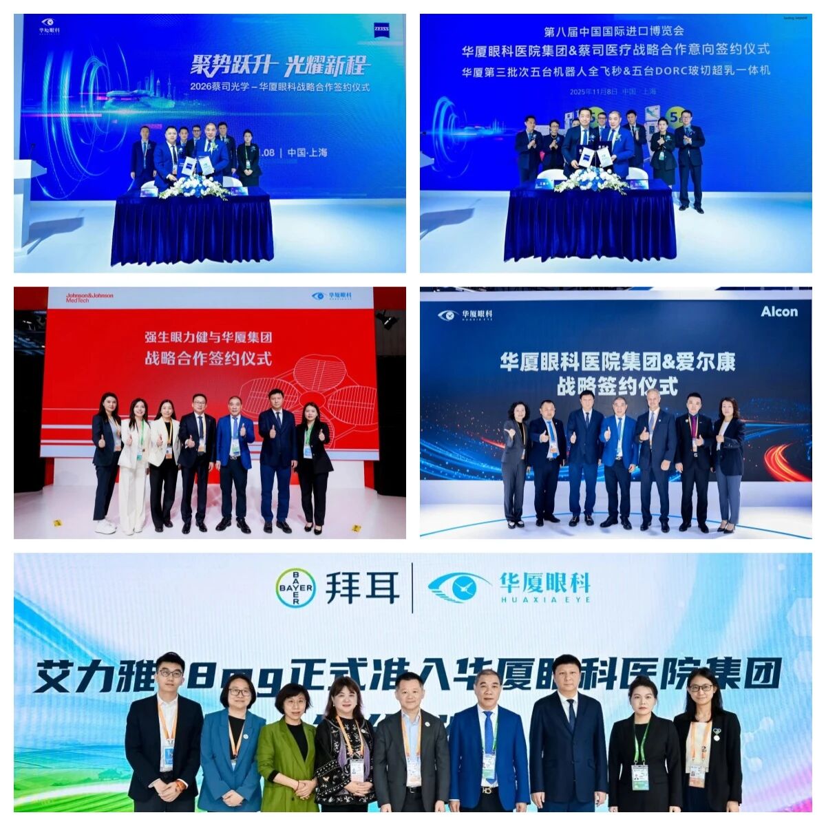 11月7日-11月8日,在第八届进博会期间, 华厦眼科 与强生眼力健、爱尔康、拜耳、蔡司达成了多项全新合作,开启合作共赢的新征程。其中, 华厦眼科 与强生眼力健、爱尔康、蔡司光学签署了2026年度战略合作协议,进一步深化在产品供应、技术赋能、学术共建、人才培养、服务升级等多维度的交流与合作,共建可持续发展的眼科诊疗新生态。